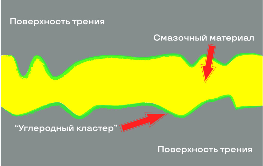 Свободные частицы «углеродного кластера» образуют несущий слой смазки более высокой вязкости и обладающий большими пределами прочности смазочного слоя.