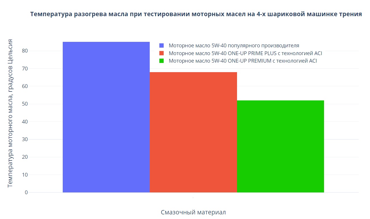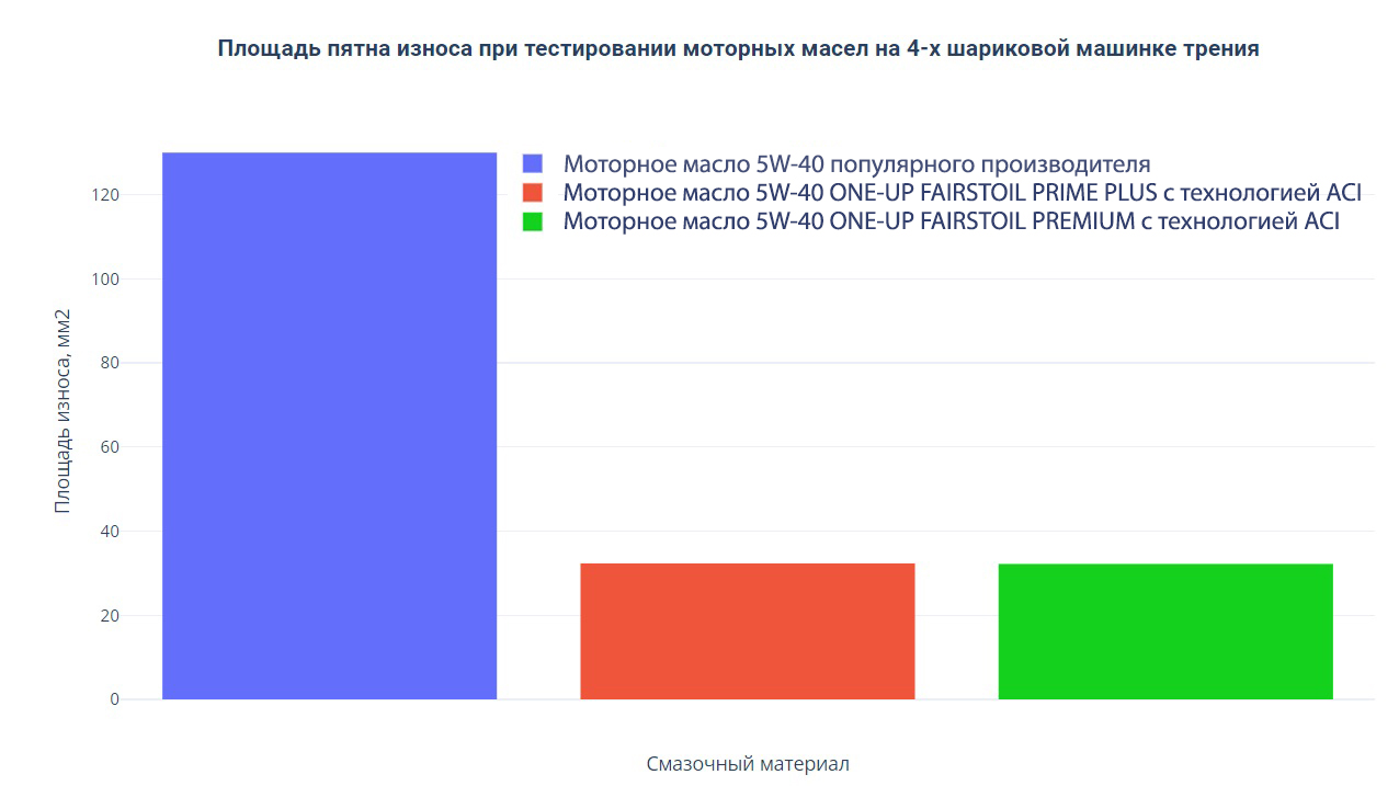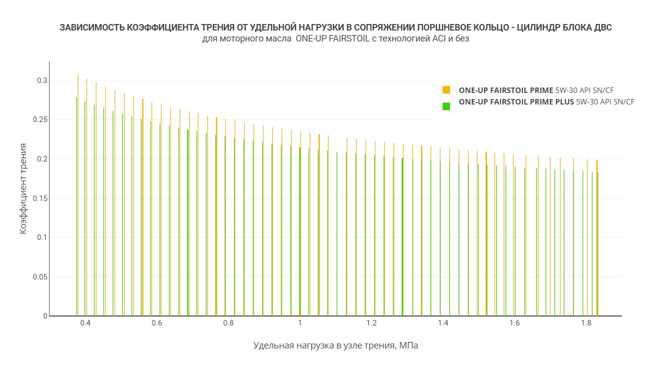 На рисунке представлены сравнительные данные по зависимости коэффициента трения от удельной нагрузки в сопряжении поршневое кольцо – цилиндр блока ДВС при использовании смазочных материалов ONE-UP FAIRSTOIL c использованием технологии ACI в моторных маслах линеек PRIME PLUS, PREMIUM, OPPOSITE, SPORT и линейки PRIME, в которой данная технология не применяется.