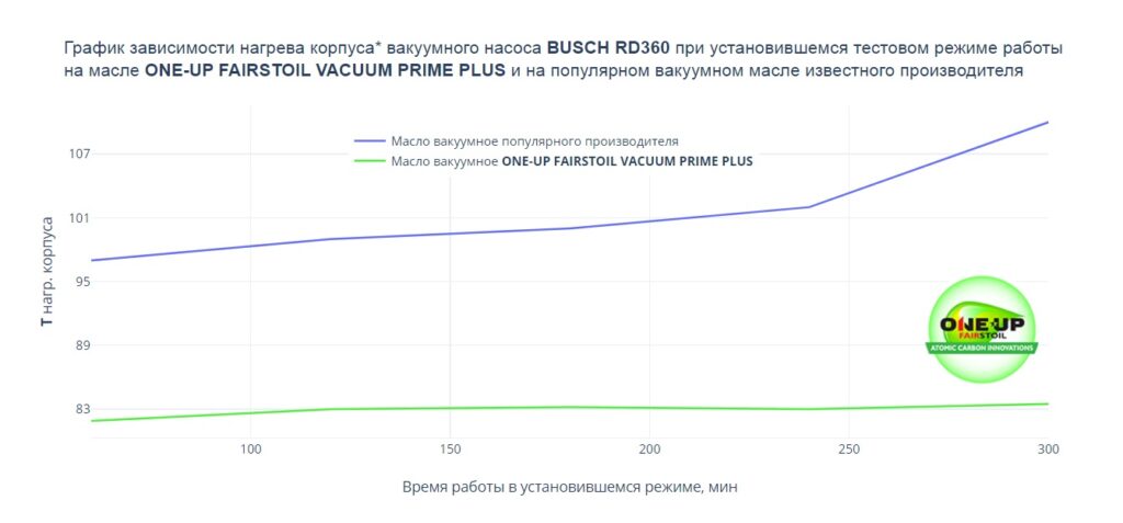 В ходе проведения испытаний вакуумного масла ONE-UP FAIRSTOIL VACUUM PRIME PLUS выявилось явное преимущество в сниженной температуре нагрева насоса (замер проводился в самой горячей точке корпуса). Тестовый режим включал в себя 10-и секундное открытие клапана сброса вакуума, через определенный промежуток времени для повышения нагрузки насоса. Длительность тестов составляла 5 часов. К сожалению, популярный продукт применяемый повсеместно (синяя линия) не выдержал испытаний (произошел “выброс” через корпус фильтра и задымление помещений), и их пришлось завершить досрочно.